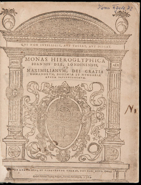 John Dee’s book Monas Hieroglyphica is an exposition upon the meaning of the symbol of that name which he invented. The text is pretty obscure and there is much debate as to what exactly Dee thought his monad to be. There have been claims it is purely alchemical, or that it is in fact a blind and the book is in fact a work on cryptography. The symbol combines the astrological and alchemical symbols of the moon, the sun, the four elements (fire, air, water, earth) and Aries. But the symbols for Mercury, Venus, Jupiter, Saturn and Mars can all be picked out as being represented in it as well as can other symbols.